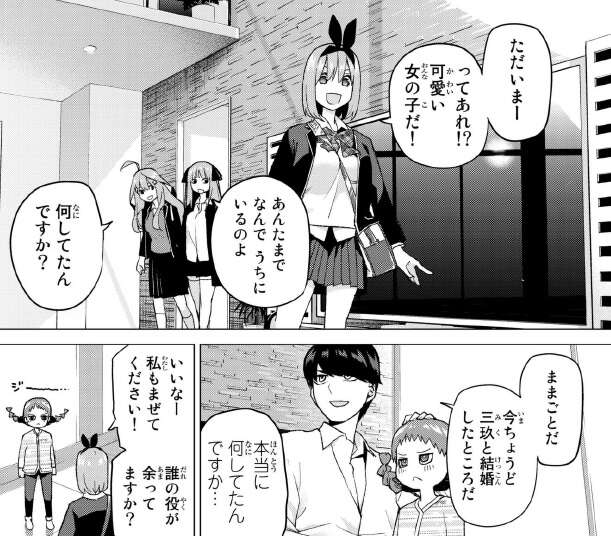 そこに二乃、四葉、五月も帰ってきて五つ子が揃いました。3人に菊ちゃんとままごとをしていた事を伝えます。