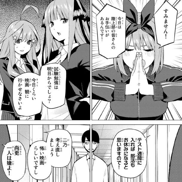 が、期末試験直前であるにも関わらず二乃、五月は映画鑑賞、四葉は陸上部の部活手伝いです。気を落とす風太郎です。仕方なく、一花と三玖とで自習を行います。
