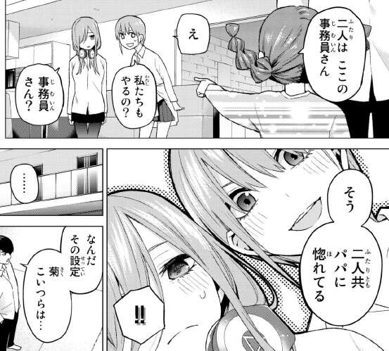 さらに菊ちゃんの遊びは続き、何故か一花と三玖が風太郎に惚れている事務員役という設定になります。