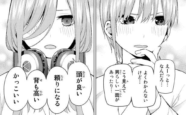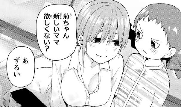 2人からママになると言われて、菊ちゃんはどこが好きか問われます。一花も三玖も好きなところをあげますが、完全に風太郎の事です。