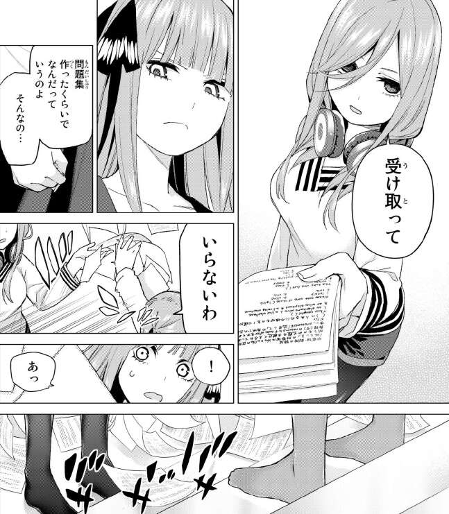 反発する二乃に三玖は、風太郎が作った問題集を受け取るように言います。しかし二乃は手で払いのけますが勢い余って問題集まで払ってしまいます。