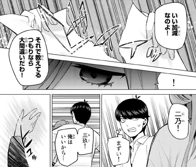 みんなで仲良く協力し合いましょうと言う五月ですが、早速二乃と三玖が言い争いを始めます。