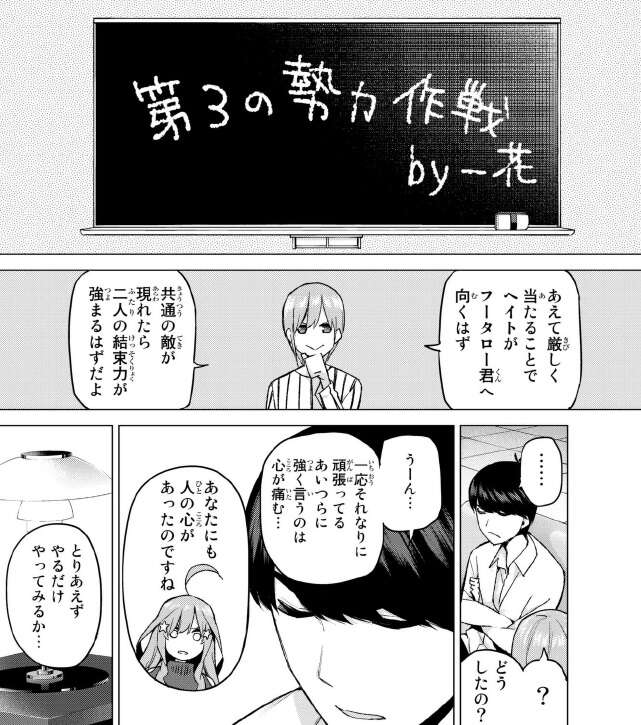続いて一花の作戦です。五つ子にあえて厳しく当たる事で、二乃と三玖の結束力を強くする作戦です。それなりに頑張っている2人に、強めに当たる事に風太郎は心を痛めます。と言っておいて、二乃と三玖に強く言っている時の風太郎は、心が痛そうどころかむしろ生き生きしています。