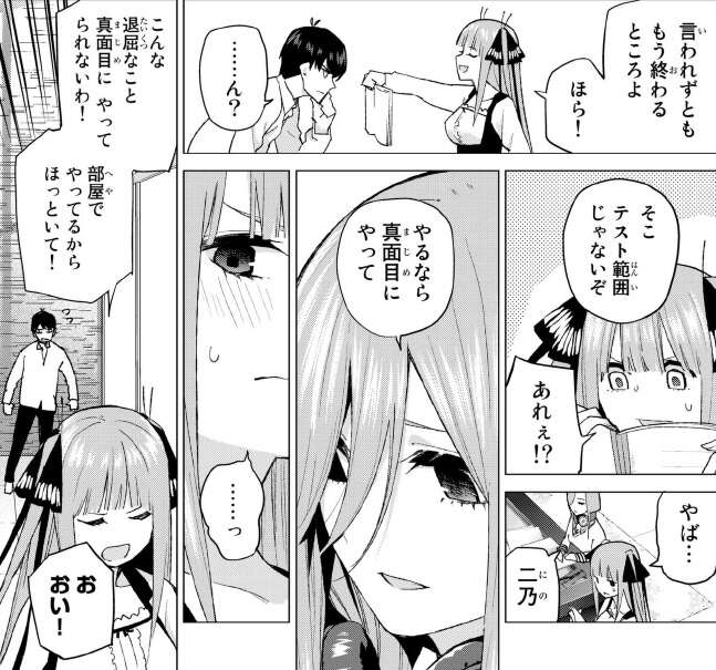 ここで二乃は既に課題範囲を済ませていると言いますが、風太郎がよく見るとテスト範囲とは違う所を解いていました。三玖から真面目にするように言われて、反発する二乃です。指摘されると反発したくなる二乃です。