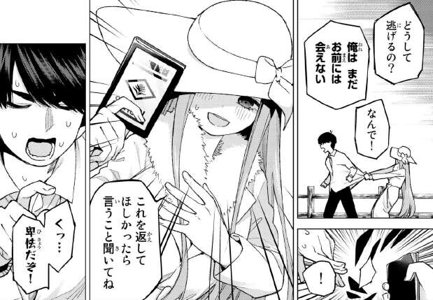 強引にボートに誘われて、ボートを漕がされる風太郎ですが、体力がない風太郎は早くもボートを漕ぐのが限界です。いまだに目の前に京都で会った女の子がいる事が信じられない風太郎。まだ名前も聞いていなかった事を思い出し、名前を聞くと「私は零奈(れな)」と言い、五年ぶりだねと語ります。さらに風太郎が勉強を頑張って学年一位でいる事、今は同級生の五つ子の家庭教師をしている事など、近況まで知っています。