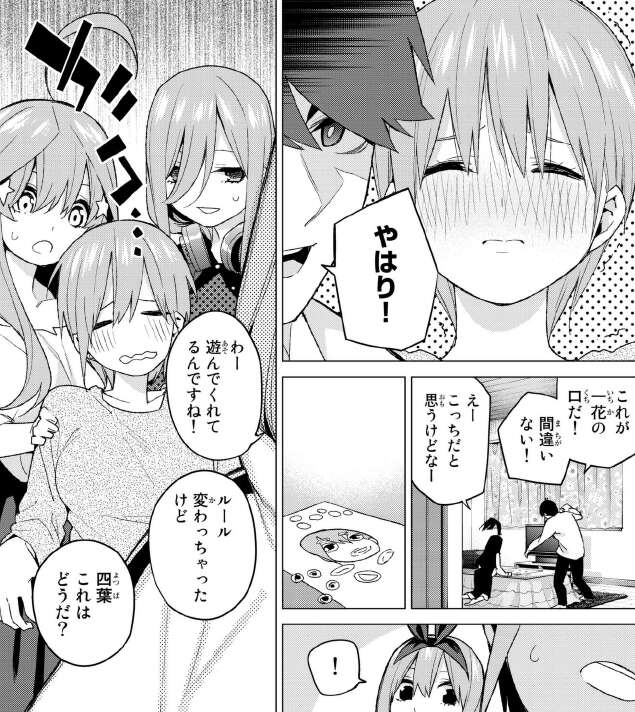 お正月という事で、初詣をした後に五つ子たちの家に寄りますが、風太郎はそこで五つ子たちから過剰なスキンシップを受けます、うらやましい。