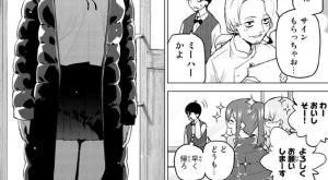 四葉は今頃になってほっぺにチューした事に気がついて、家庭教師のお礼という事にしようとします。しかし、三玖の殺気を帯びた視線に四葉が気づき怯えます。
