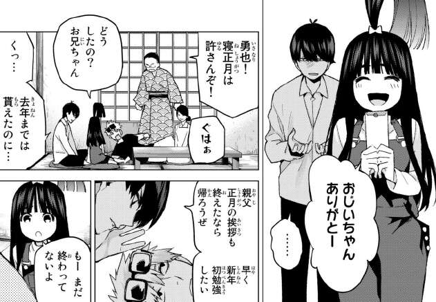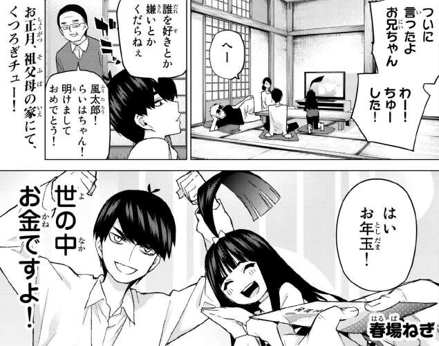 がお年玉は妹のらいはにだけで、風太郎のあてが外れます。お年玉を貰えなかったので、早く自宅に帰って初勉強をしたいと言います。しかしらいはから初詣に誘われていやいやながら、初詣に出かけます。