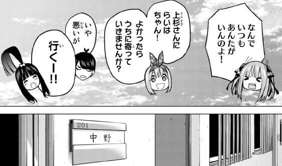 二乃には嫌がられますが、四葉に誘われて風太郎は断ろうとしますが、結局らいはの要望で五つ子たちの家に行きます。