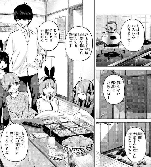 ここでもテレビを見ながらくつろぐ、二乃、四葉、五月ですが、風太郎はテレビの内容に興味が無いので今すぐにでも帰りたがります。