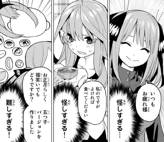 二乃がいつもより優しく、食いしんぼうの五月が自分の食べ物をあげようとしたりして怪しすぎます。四葉はいつも通りみたいですが。