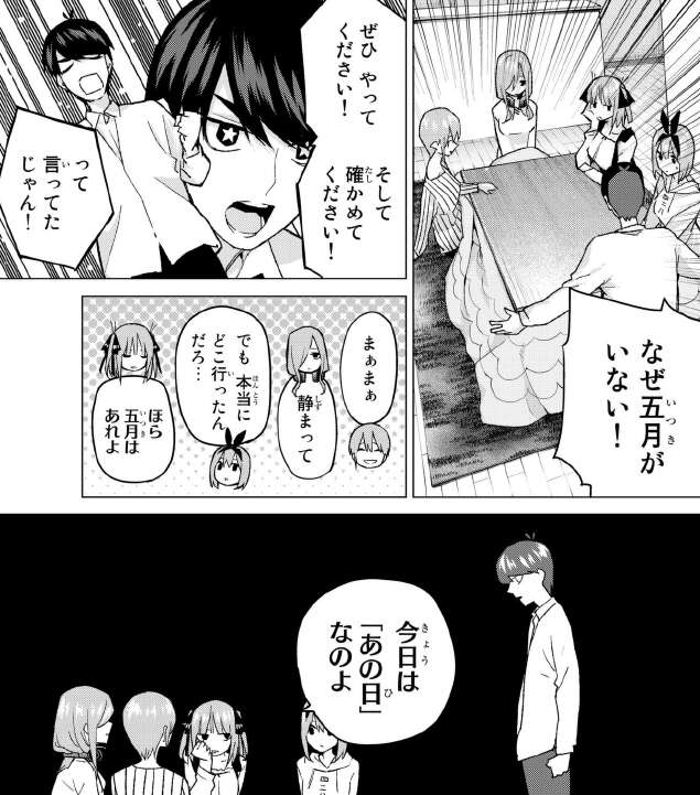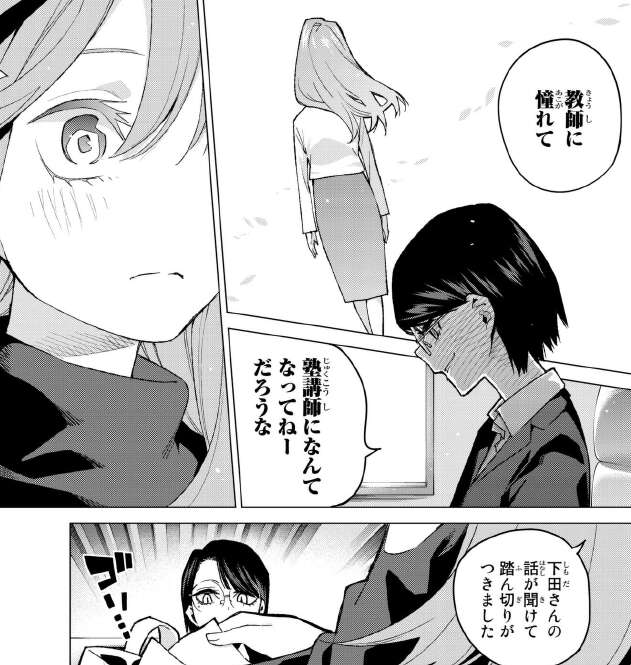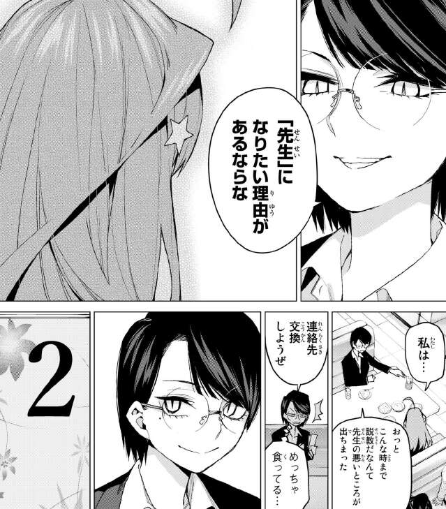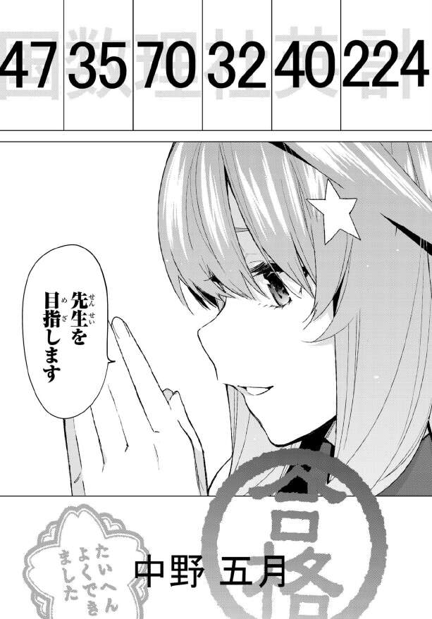 今回の話で五つ子たちの母親の職業が教師で、五月が「先生」という職業を目指している事が判明しました。「先生」を目指すようになったのは、風太郎を含んだ五つ子たちとの勉強生活も影響していそうです。五月が無事に「先生」になれますように。