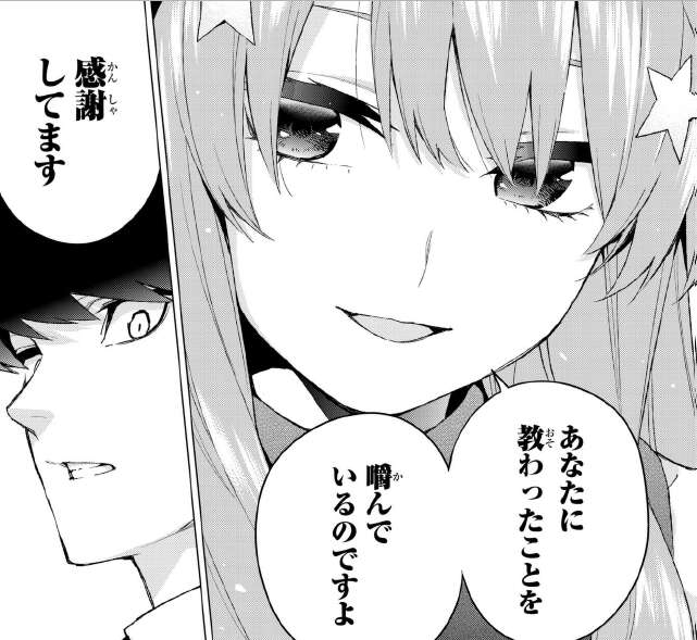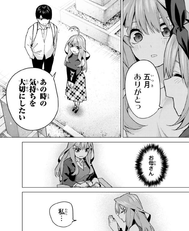 五月は四葉から勉強を教えた時に感謝された気持ちをすごく大切にしているようです。そして母親に対する思いがさらに強くなっているようで、ある決意をします。