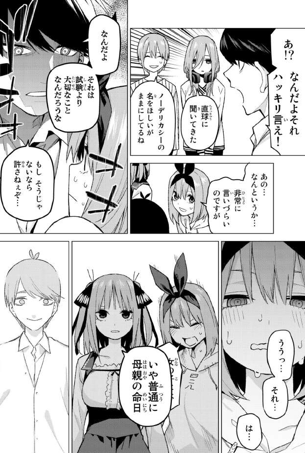 「あの日」とは何かを超直球で聞く、風太郎です。普通、ちょっとは躊躇するものですが、風太郎には関係ありません。四葉が勘違いしているようですが、結局「あの日」とは、母親の命日だそうです。正確には月命日のようです。