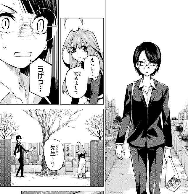 場面変わって、墓参り中の五月です。母親のお墓を参っていると五月を「先生」と呼ぶ、女性が同じく、五つ子たちの母親の墓参りに来て、五月を見て驚きました。