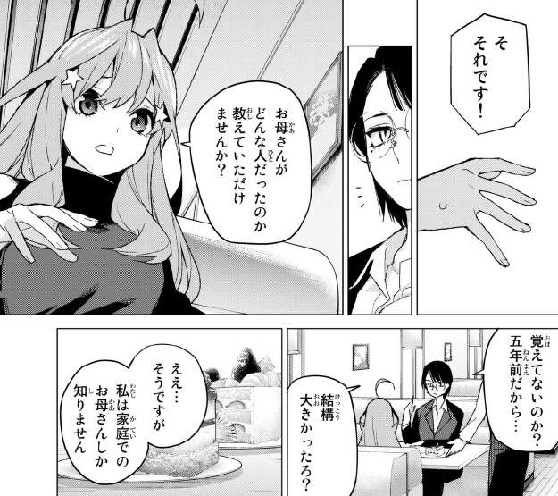 話を聞いてみると、中野母の元教え子で五月があまりに母親に似ていたので、間違えてしまったそうです。ここで会ったのも何かの縁と、五月にケーキをおごります。ちなみに二人がいるケーキ屋は、風太郎がアルバイトしていたケーキ屋ですね。