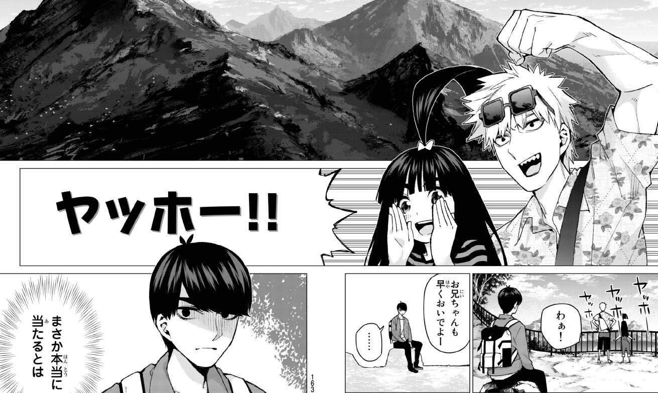 結局、風太郎は春休みにじっくり考えようと思い、春休みを迎えます。そして豪華賞品の旅行ペアチケットが、上杉家一家にあたったようです。上杉家、全員で家族旅行です。ちなみに1人分は自腹だそうです。