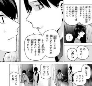 前回、五月から唐突に家庭教師の関係に終止符を打ちましょうと言われ、混乱する風太郎です。その後、さらに五つ子の祖父と言う、おじいさんに背負い投げされて五月を見失ってしまいます。とりあえず、おじいさんの方より五月を探します。しかし、五月がいなくなった方へ走ると、中野パパが五つ子の部屋へ進ませてくれません。まあ、父親としては当然ですが。