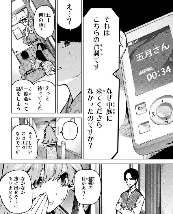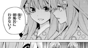 風太郎が指定したのは、混浴もある温泉でした。早速、父親の目が届かない温泉で昨日、五月から家庭教師を辞めるように促された事を確認します。やはり、五月はそんな事は言っていないようです。五月は自分のフリが出来るのは、他の四人しかあり得ないと言います。