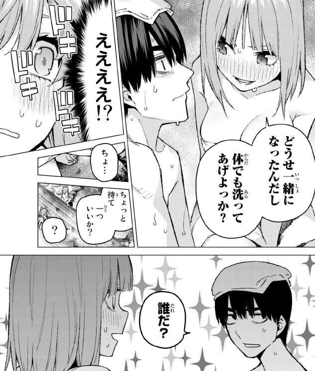 まさか風太郎が二乃と五月、二人と混浴できるとは。二人も大胆ですね。