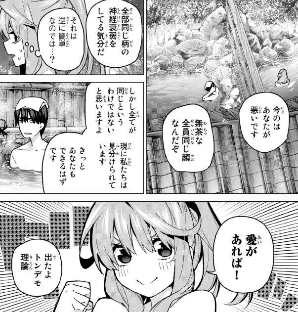 二乃がいなくなり、風太郎が悪いと五月に責められますが全員同じ顔だから見分けるのは無茶だと言います。しかし五月は、全てが同じというわけではない、現に私たちは見分けられていると言い、きっと風太郎にも出来るはず、「愛があれば!」と無茶ぶりします。