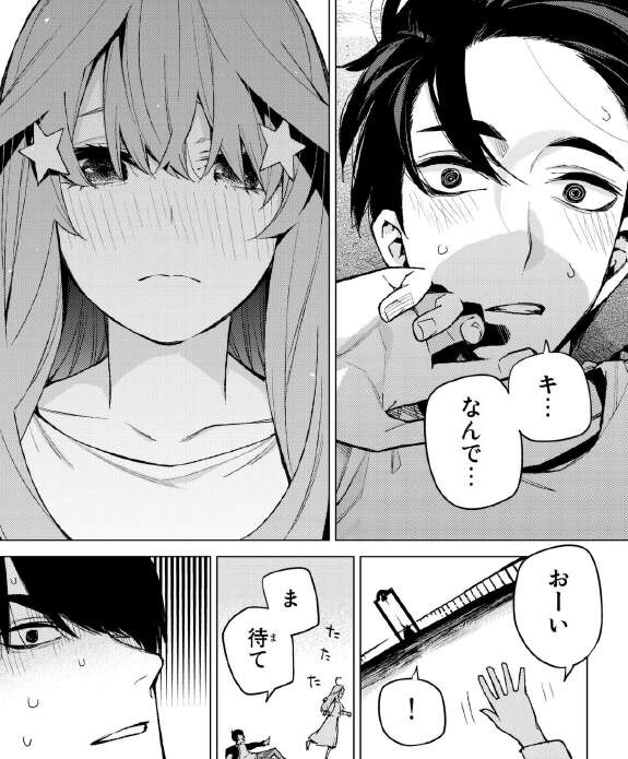 突然のキスにびっくりしている風太郎ですが、五つ子の誰かも顔真っ赤です。その後別の人に呼ばれて走って去っていきます。呆然とする風太郎。