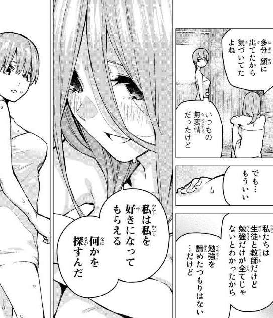 一方、一花と三玖はサウナ室にいます。三玖は期末試験で一花に点数で負けたことを本当は悔しかったと話します。しかし、今は生徒と教師だけど勉強だけが全てじゃないと分かったといいます。勉強を諦めたつもりはないが、自分は自分で好きになってもらえる何かを探すと正直な気持ちを告白します。