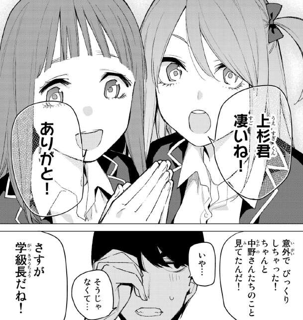 最初は風太郎の不愛想で社交性の無い性格に、クラスメイト全体から誤解されそうでしたが、学級長として、そして五つ子の窓口としてクラスにも溶け込めて、誤解されずにすみました。