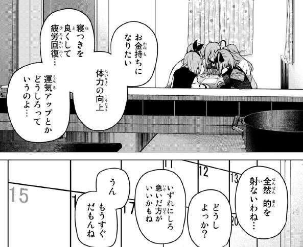 一方、五つ子たちは風太郎の誕生日を企画しているようですが、風太郎のあの五つのお願いをどう実現するのでしょうか。多分、五つ子それぞれがお願いを一つずつ実現しようと頑張るのでしょうが。