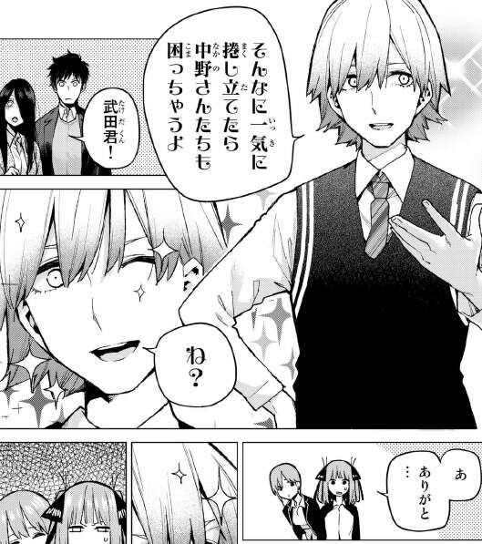 五つ子を見分けられる風太郎はクラスメイトから凄いとお礼を言われ、ちゃんと五つ子の事を見ていてさすが学級長と、風太郎を見直します。三玖はクラスメイトの女生徒が風太郎にベタベタしていることに嫉妬しますが、五月は風太郎も変わってきていると言い、四葉が推薦したのも間違いではなかったと見直します。