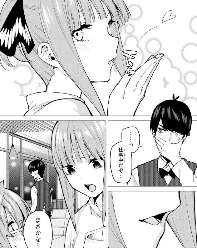 今回、二乃のアルバイトデビューでした。二乃らしく、アルバイト先でもそつなくこなせそうでしたが、失敗もしてしまいます。そこを風太郎にフォローしてもらい改めて、風太郎に告白しなおしてアピールしています。