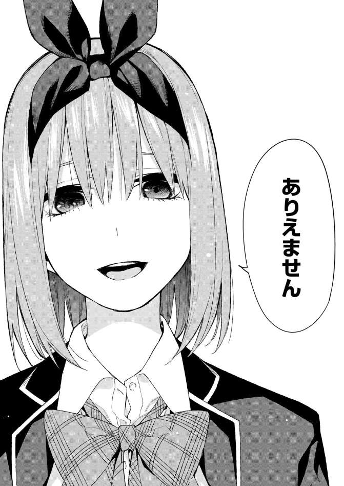 四葉と風太郎に思わぬ噂が立ち、天真爛漫な四葉もこの噂には困ります。クラスの女の子から言われて、変に意識し始める四葉ですが、最終的には風太郎がこの先誰を好きになっても応援すると笑顔で返します。その後、クラスの女の子から再度冷やかされても、冷静に笑顔でありえません、と返事する場面は印象的です。