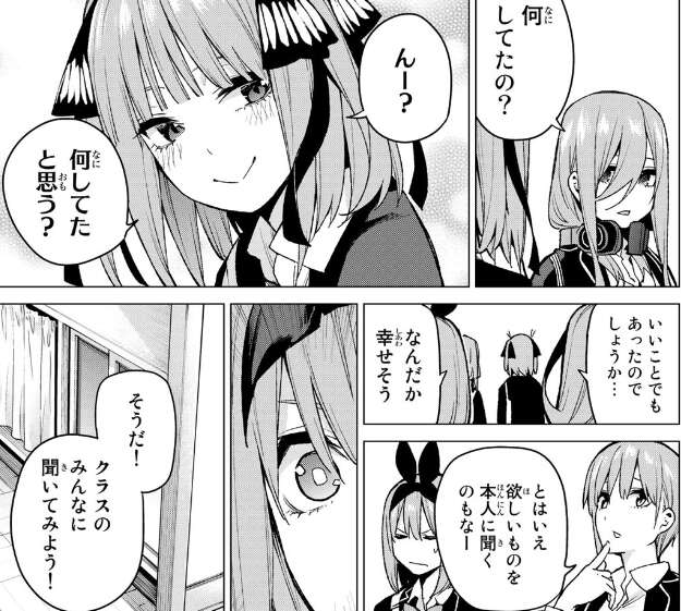 先週のバイトで風太郎と仕事中にイチャイチャできて、幸せそうな二乃ですが風太郎の誕生日での欲しいものがまだ聞けていません。本人に欲しいものを聞くのも違うと思っていると、四葉がクラスのみんなに聞いて回ります。