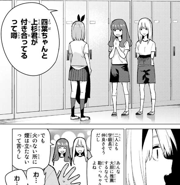 が、クラスの一部は既に上杉の事を忘れており、学級長がそんな名前だった程度の認識です。武田に聞いても、そういうのを受け取らないタイプだと言われます。さらに、他の女子から風太郎と四葉が付き合っているという噂を聞き、びっくりします。四葉は風太郎と付き合うなんて、恐れ多いと謙遜します。しかし、クラスの女子からは風太郎の方は満更でもないかもよ、言われ四葉は意識し始めます。