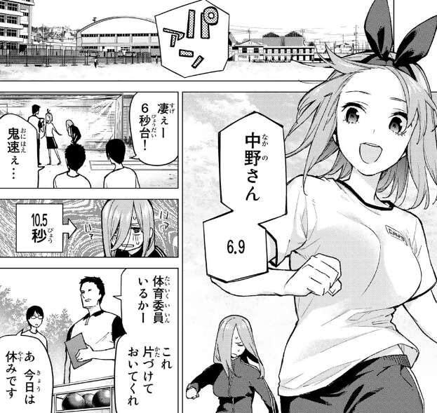 場面変わって、体育の時間では50mのタイムを計りますが、四葉は自慢の足を活かして6.9秒のタイムです。ちなみに、三玖は10.5秒と散々です。