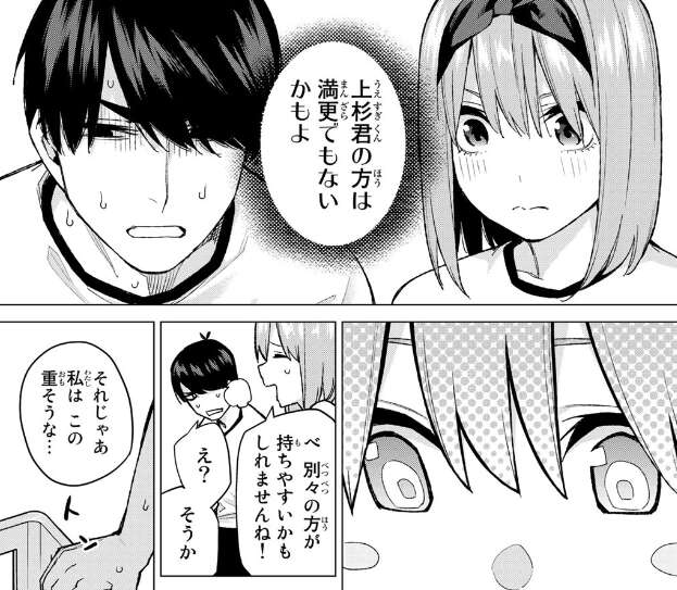 体育の後、教師から片づけを頼まれますが、四葉は風太郎と一緒に運ぼうとして、さっきの言葉を思い出し、急に意識し始めます。風太郎は自分から重い方を持つと言い出しますが、非力な風太郎では持つことも出来ず、結局二人で片付けます。