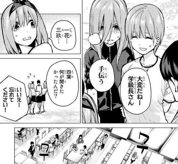 クラスから二人で片付けているところを見られて、四葉はさらに意識しますが、一花と三玖が手伝ってくれます。