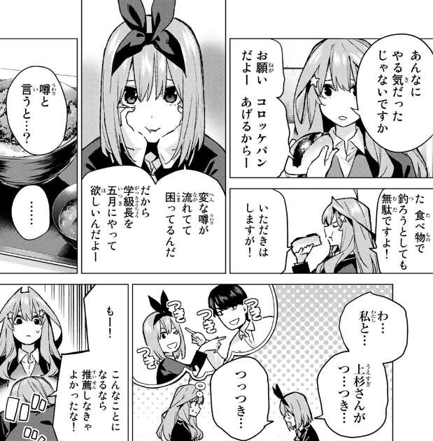 四葉はついに耐え切れなくなり、五月に学級長を変わって欲しいとコロッケパンで釣って、お願いします。五月はあんなにやる気だったと理由を聞くと、四葉は正直に風太郎と変な噂が流れて困っていると相談します。四葉は単純に、風太郎がすごい人だってクラスのみんなに知って欲しかっただけだと正直な気持ちを口にします。
