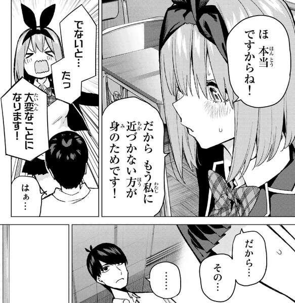 結局、四葉は意識しすぎてしまい、いきなり風太郎に嫌いと言って、近寄るなと言い始めて、風太郎から何を気にしているのか質問されます。正直に、クラス内で二人が付き合っていると言う噂があると教えると、あり得ないとうわさ話に呆れます。