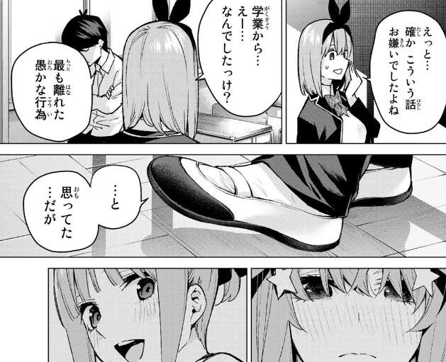 四葉は風太郎が恋バナを嫌いだと以前言っていた事を思い出し、学業から最も離れた愚かな行為ですよねと風太郎に聞くと、今はあそこまで真剣な気持ちを前ほど馬鹿にする気もおきないな、と心境が以前と変わっていると言います。