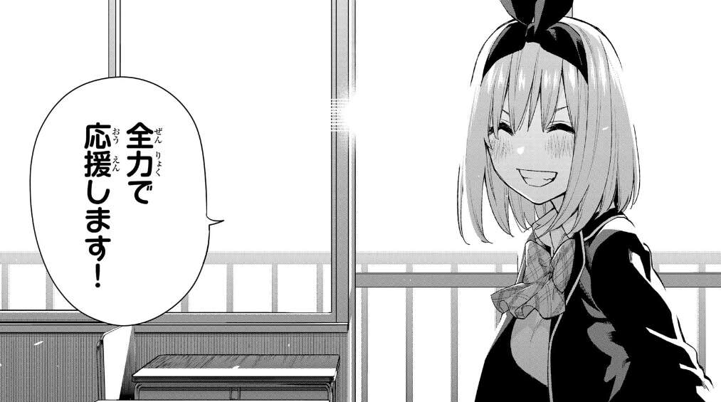 風太郎の心境の変化に、四葉はついに誰か好きに、まさかの本当に私のことを!?風太郎に特定の誰かがいないか迫ります。四葉は三玖を押したりしますが、風太郎は何故そこで三玖を押すのか分からず、四葉から「道のりは長そうですね…」と言われます。しかし、風太郎がこの先誰を好きになっても、どんな恋をしても私は味方ですと笑顔で応援すると言います。気がはぇーよと、顔に汗を流して風太郎は返事します。