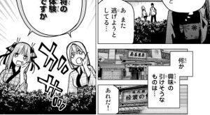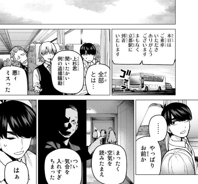 集合場所から帰りのバスに乗り、京都駅に向かっているバスの中で風太郎は全部嘘だよ、の全部の意味を考えながら、一花の想いをはかりかねています。一方、武田から盗撮騒動の話を振られて、前田が風太郎に謝ってきます。盗撮犯の正体は前田で、風太郎から頼まれて五つ子たちの写真を撮っていたようですが、気合を入れすぎてしまったようです。