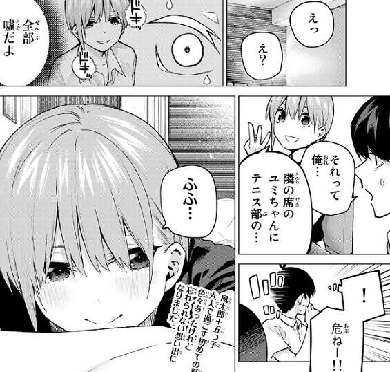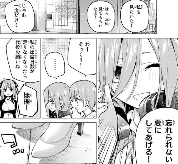 一花は仕事が終わった後、風太郎と勉強して授業に追いつけるように頑張っていますが、日中のロケで一花はバテ気味です。風太郎がこのままだと他の四人と卒業できないと言うと、一花から卒業したいのは妹たちとだけじゃないと呟かれます。風太郎は一瞬期待しますが、隣の席のユミちゃんやテニス部の友達の名前を出されます。風太郎は変な期待をしたと内心焦りますが、隣で一花が意味深な笑みを浮かべています。