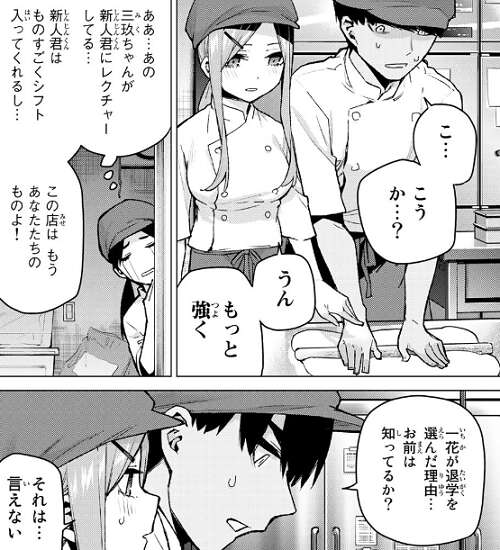 場面変わって風太郎は三玖と一緒に、三玖がバイトをしているパン屋にいます。一緒に三玖と作業をしながら風太郎は、一花が退学を選んだ理由を三玖に質問しますが、三玖には言えないと返されてしまいます。逆に、三玖から風太郎はなんで一花を引き留めようとするのか質問されます。