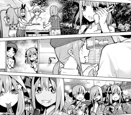 そしてここで、五つ子たちの夏の思い出が挿入されます。一花は女優の仕事、二乃は山で五人でのキャンプ、三玖は風太郎とのバイト、四葉は五人での花火大会、五月は塾で受験対策の勉強に打ち込む、がそれぞれ夏の思い出のようです。