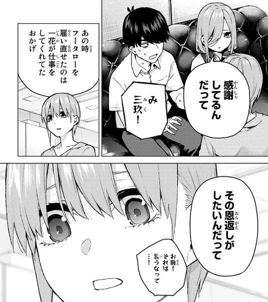 一花からなんでそこまでするのかと言われ、最初は一度辞めた家庭教師の仕事を引き戻した一花が勝手に降りたことにイラついていると言いますが、三玖からあっさりと違うと否定されます。三玖は風太郎が一花に感謝していて、風太郎を再び家庭教師として雇いなおせたのは一花が仕事をしていてくれたおかげなので、恩返しがしたかったと風太郎の気持ちをばらします。三玖にばらされて、恥ずかしがる風太郎です。