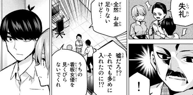 この金で雇われてくれと風太郎は、パン屋でバイトして稼いだであろう金を差し出します。社長から一応確認と、中身をチェックされると一花の女優としてのギャラを考えると全然足りないようでした。多めに入れたと驚く風太郎に、うちの看板女優を見くびらないでくれと社長に言われてしまいます。