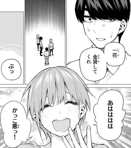 結局一花に足りない金を借りようとする風太郎、途中まで良かったのにと笑われショックを受ける風太郎です。しかし一花は足りない分は出世払いでと、風太郎の申し出を受けて契約成立となりました。