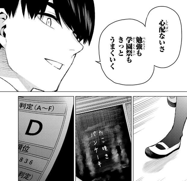 一花は他の四人の大学入試を頼むと言い、風太郎は勉強も学園祭もうまくいくと自信がありそうですが、誰かの入試判定「D」の紙が見えます。