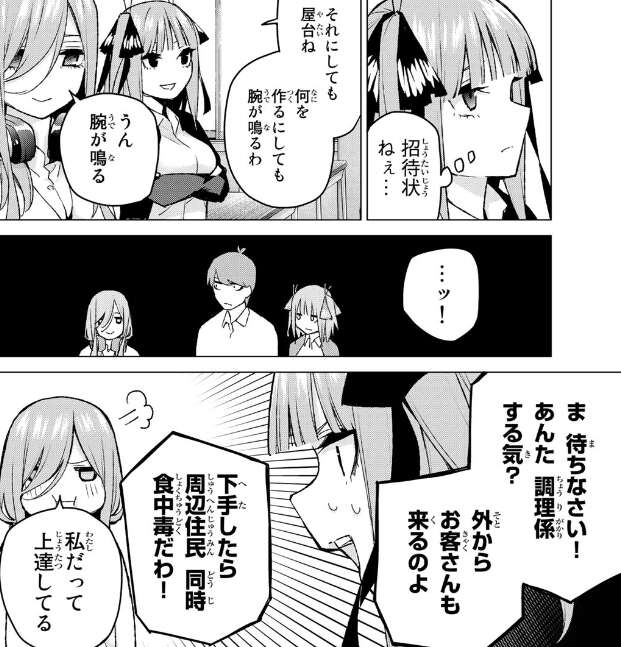 二乃は学園祭の招待状の事を考えながら、屋台を楽しみしていると三玖も腕が鳴るとやる気満々です。三玖の料理下手を知っている二乃は、三玖が調理係をする事に反対しますが、三玖は自分も上達しているし、二乃もいるから安心だと断言します。